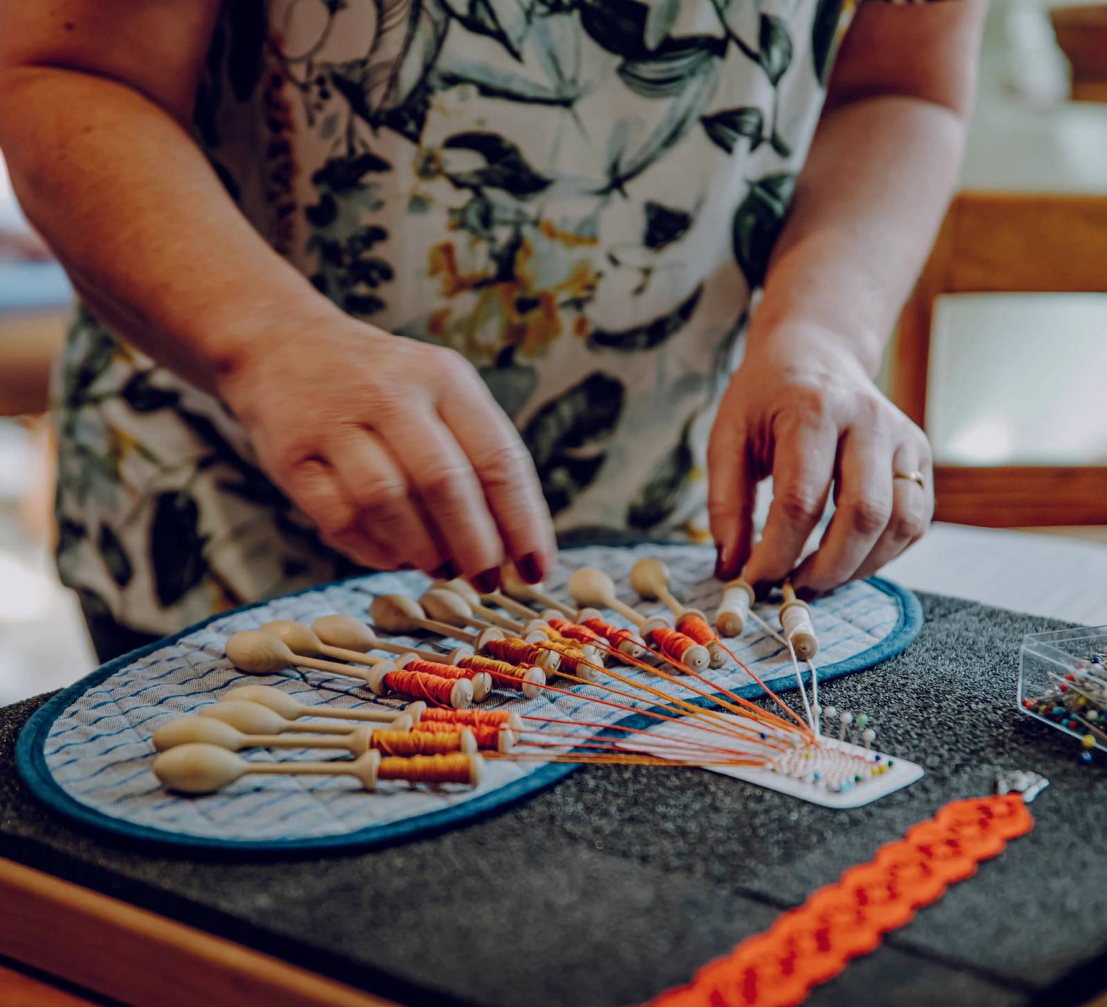 Briefe, Schiffchen und Knoten: Was nach Post, hoher See und Schifffahrt klingt, gehört zu den Grundlagen historischer Handwerkstechniken. Sylvia Ulrich und Barbara Leist zeigen im Esszimmer des Museum Lindwurm, wie kunstvolle Spitze in Handarbeit hergestellt wurde. Beide Techniken können auch an den ausgestellten historischen Kleidern bewundert werden, wie an Nachthemden und Spitzenkrägen.