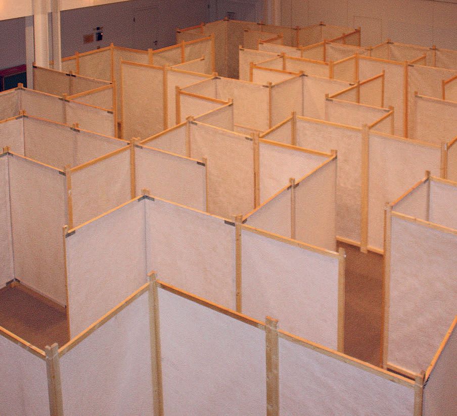 Wer hat den Mut, den Irrgarten zu betreten? Viele Wege stehen offen – manche führen ins Nichts, andere in die Irre. Doch wer sich dem Spiel aus Irrwegen und Einsichten stellt, wird am Ende belohnt: Hoch oben auf dem Podest gewinnt man den Überblick – und das Chaos ordnet sich wie von selbst. Eine Installation von Kleinaberfein, Tüftelatelier.