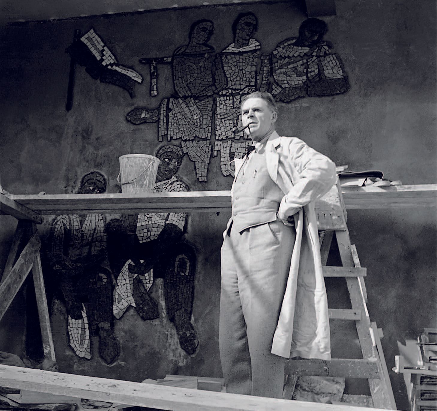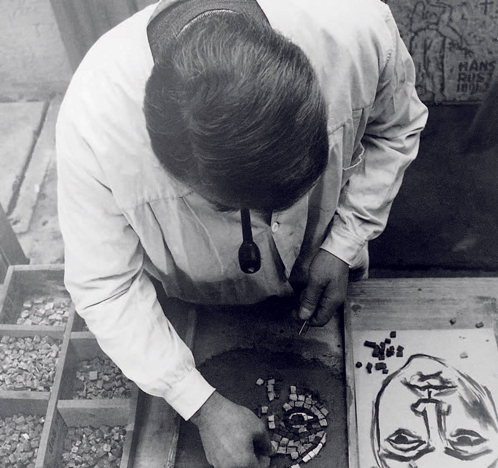 1926 entdeckt der Diessenhofener Künstler Carl Roesch die Mosaiktechnik für sich. Er zerschlug am Rheinufer gesammelte Steine und begann, eine Serie von Porträtköpfen zu legen. «Welche Möglichkeiten!», schrieb er in sein Tagebuch. In den folgenden Jahren realisierte er über ein Dutzend, zum Teil grossformatige Mosaiken im öffentlichen Raum. Die obenstehende Fotografie zeigt den Künstler in Paris, wo er 1937 im Schweizer Pavillon der Weltausstellung eine seiner bedeutendsten Arbeiten produzieren konnte.