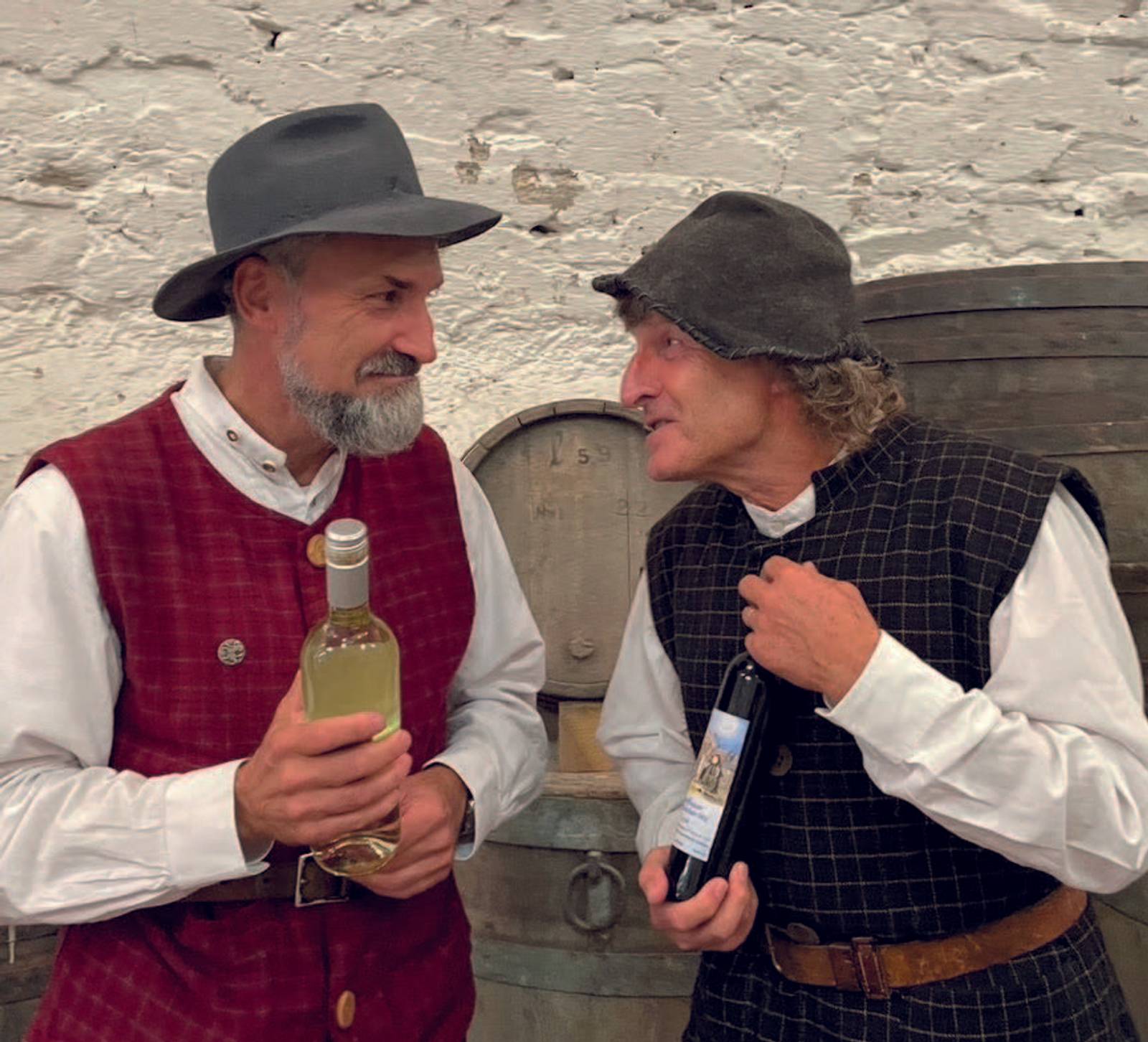 Schaffhauser Weingeschichte(n) – Beat De Ventura und Martin Harzenmoser schlüpfen in die Rolle von zwei Rebleuten und erzählen allerlei Wissenswertes und Erheiterndes über den Schaffhauser Weinbau. Wo lag sein Ursprung? Warum wurden selbst in Hemmental Reben angebaut? Wie gross war das grösste Fass? Und warum gibt es 31 Ausdrücke fürs Betrunkensein in unserem Dialekt? Zum Schluss der Darbietung wird natürlich noch ein Bogen zu den hervorragenden Schaffhauser Weinen der heutigen Zeit geschlagen.